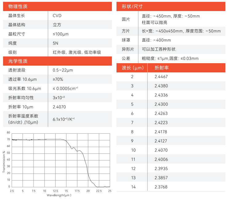硒化锌(ZnSe)是一种光学材料,具有纯度高、环境适应能力强、易于加工等特点。可广泛应用于激光系统和红外热成像系统,光传输损耗小,具有很好的透光性能。硒化锌在10.6μm,吸收率比较低,是高功率CO2激光光学元件的首选材料。同时,硒化锌也可应用在各种聚焦镜、窗口材料、输出耦合和扩束镜。由于其卓越的光学性能,在其整个透光范围内,成为不同光学系统中所普遍使用的材料。广泛应用于激光、医学,天文学和红外夜视等领域中。ag厅总部科技拥有专业的技术和多年的生产经验,长期为国内外多个知名公司供应高质量的硒化锌毛坯料及光学镜片。