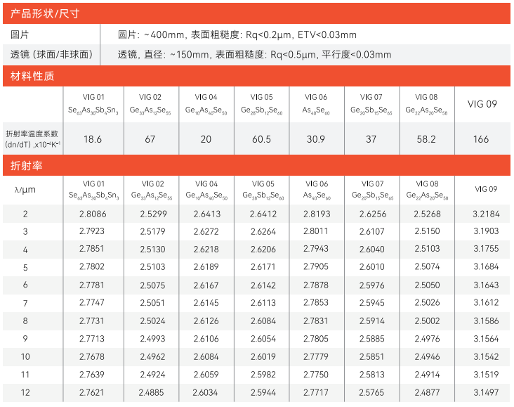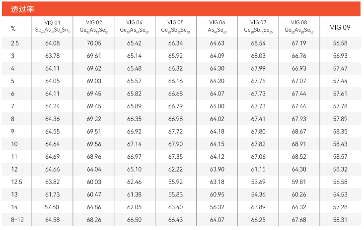 硫系玻璃具有优越的折射率均匀性和稳定性,是实现2-12μm范围内红外光学镜头色差校正和避免热散焦的理想光学材料。同时由于硫系玻璃较低的热转变温度和稳定的化学性质,可使用精密模压的方式加工制造硫系玻璃镜片,为大规模批量化生产提供了便利条件。硫系玻璃主要应用于监控设备及系统、海洋/船舶、消防/警用、传感器、红外产品。 ag厅总部科技生产高纯度、高均匀性以及各种不同组分、尺寸的高品质硫系玻璃,主要包括Ge-As-Se、Ge-Sb-Se、As-Se 等系列产品。硫系玻璃的加工方式多样,可通过模压,机械加工,抛光等工艺制造平面、球面、非球面等产品。