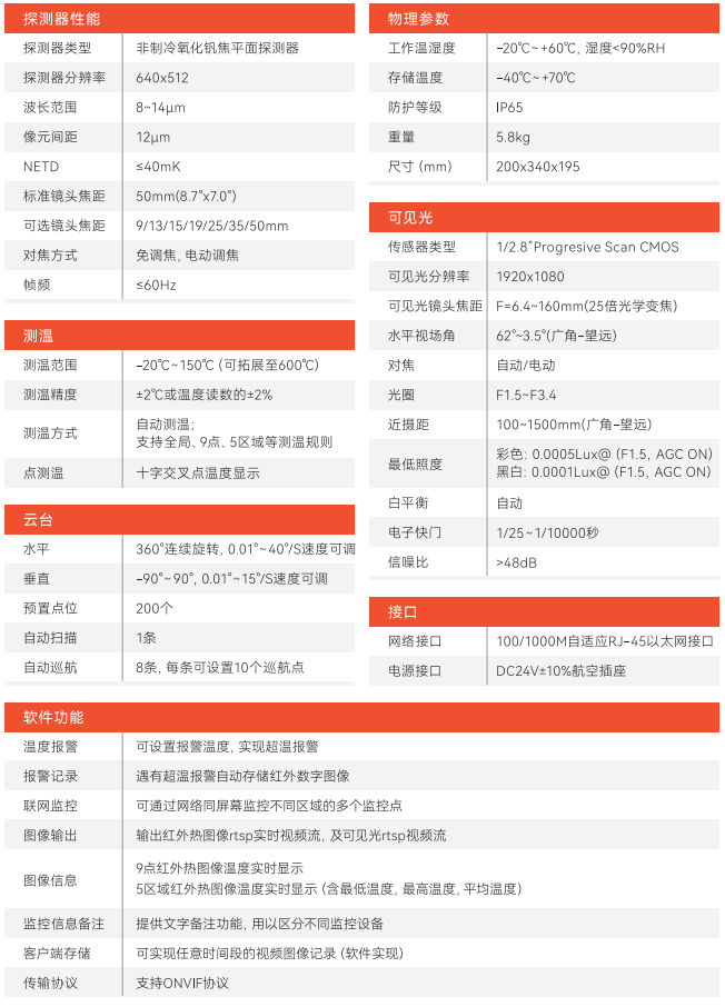 双光谱测温T型云台内置高灵敏度红外探测器,具有探测距离远、容易发现隐蔽目标等特点。不受光照环境影响,在无光、逆光等环境下清晰准确获取图像信息,可实现全天时24小时监控。该摄像机具备远程配置能力、简单操作、性能可靠稳定、系统接入简单方便等特性,可广泛应用于消防、电力、林业、工业园区、禁捕等行业及场所。