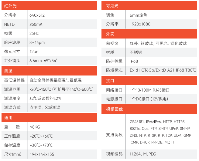SME系列测温防爆筒机集热成像监测、红外测温、可见光检测功能于一体。产品采用先进的高分辨率氧化钒非制冷红外探测器,图像质量出色,测温准确,稳定可靠。可广泛应用在纺织、化工、煤矿及石油石化等领域,助力企业安全生产,切实保障周界安全。