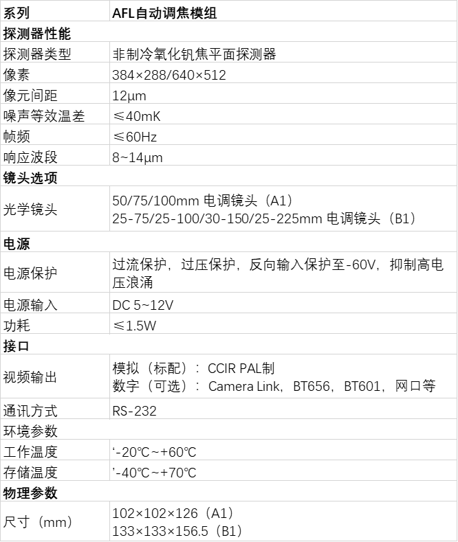 AFL自动调焦模组系列采用384x288/640x512分辨率探测器,具有高灵敏度、高精度、高帧频、图像清晰等优点,配备长焦高清电调镜头,在各种复杂的应用场景中成像质量优异,可广泛应用于森林防火、机场空防、高空瞭望等场景。